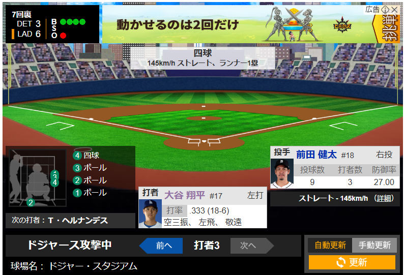 大谷翔平選手は四球後、盗塁成功