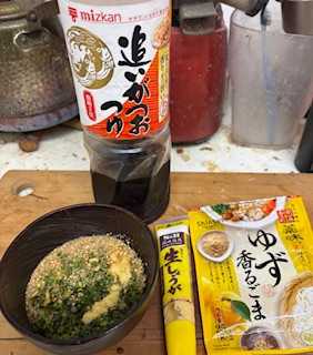 薬味は、細ネギとおろししょうが、ゆず香るごまをめんつゆで