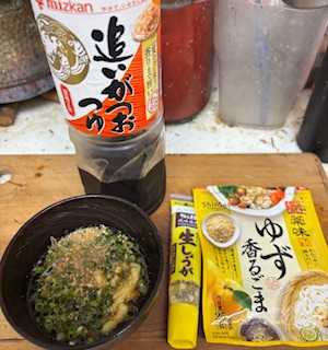 薬味は、細ネギとおろししょうが、ゆず香るごまをめんつゆで