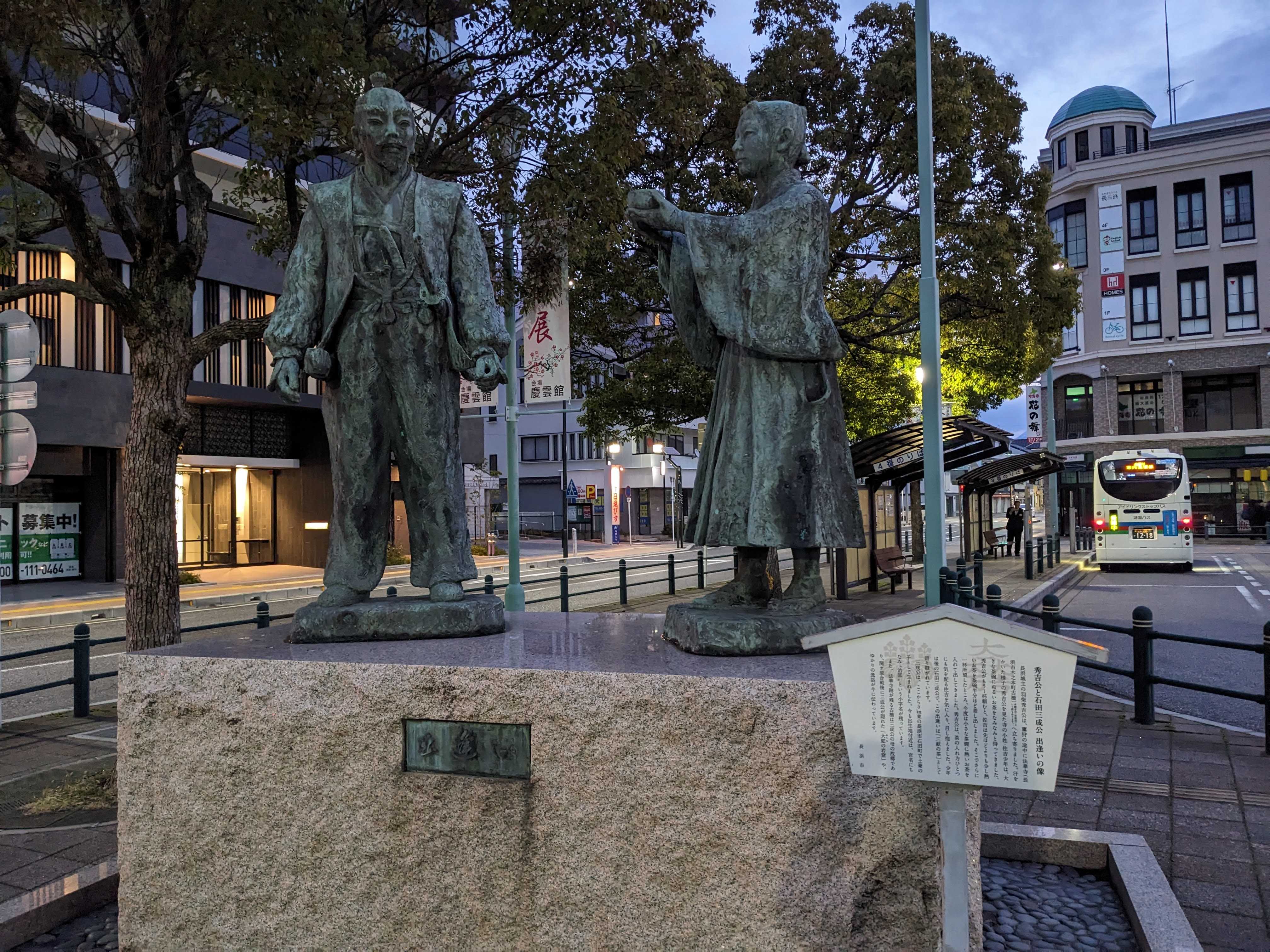 長浜駅に立ち寄りました。豊臣(羽柴)秀吉が浅井長政との戦で功績を挙げた際、当時「今浜」と呼ばれていた地名を、織田信長の「長」の字を取って「長浜」と改名したと伝えられています。そのような背景から、駅周辺には豊臣秀吉の銅像や絵が飾られており、単なる駅でありながら、歴史を感じられる観光スポットとして訪れるのも良いと思います。