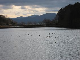 きれいな池がありました。灌漑用のため池であるとか。京都の西隣亀岡にある平の沢池です。よく見ると、たくさんの鳥が。アップして見ると。。たぶんマガモのようです。(違っていたらごめんなさい)たくさん、来ていますね。土曜の夕刻、ほっと心の和む時間でした