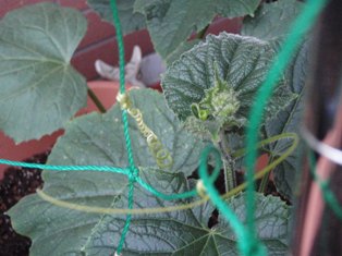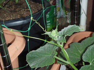去年、突然死を遂げたキュウリ。それからキュウリはやめようと思っていたんだけど・・・皆さんのきゅうり報告に刺激され、仲間入り。かぼちゃがうどん粉にやられ絶滅したので、「ウドンコツヨシ君」弦を巻きつけようと両手を伸ばし踊っているようにも見えました。しっかりまきつきましたね。がんばれ~