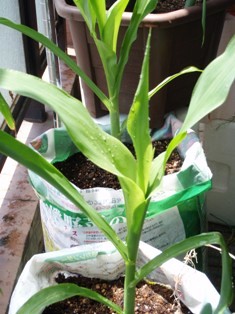 苗で買ってきたとうもろこし。2本立ちだったので、1本ずつ分けてみたら、なんとか成功したようです。今のところ順調かな?