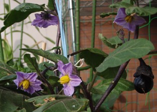 アブラーの攻撃に耐え、勝利したなすび。葉っぱの傷跡が痛々しいですが、勝利を祝う花が一斉に咲きました。実も順調。おまけ・・・なすびの逆上がり~
