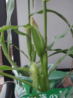 ベランダもろこし。畑になっているのしか見たことないからこういう風になるんですね~育ててみて初めてわかります。まず、花が咲きます。そして、そこに実がなり、さらにのびていく・・・そおいうものだと思っていたら・・・ぜんぜん違いました。葉っぱにわき毛のように毛が・・・茎が太くなり、ヒゲものびます。そして・・・なんか、それらしくなってきたでしょ?すぐ下にも実が着いてます。いや~楽しいですな~