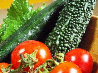 キュウリ、トマト、ゴーヤ、シソ。とりあえず収穫。なんだか苦労の割りに収穫少ないなあ・・・