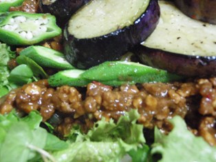 ちょっとはまっちゃいました。キーマドライカレー。挽肉と玉ねぎ、にんじんをみじん切りして炒めてから鶏出汁で煮込み、市販のカレールーをいれ、水分がある程度なくなるまで炒め、ベースは出来上がり。ご飯をよそって、ベランダで収穫したレタス、そばの芽を周りにあしらって、カレーを盛り、トッピングにオクラを湯がき、ナスをソテー。そして混ぜ混ぜして食べる。これがメチャメチャうま~い!!「夏野菜とサラダ仕立てのキーマカレー」どこかのメニューにできる代物ですぞ。オクラとナスはこれからベランダでたっぷり収穫できるとして、レタス・・・撤収しちゃったからなあ~今度はサラダ菜でやってみよう。