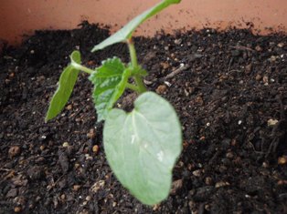 オクラがやっと・・・本葉が出て、それらしくなってきました。元気に育って大好きな実をいっぱい食べさせてくれよ!