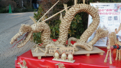 干支の龍深大寺門前の土産物屋に大きな干支の龍が縁台に飾ってあった。藁で作ってあったが見ての通り迫力がある。その横には縁結びの赤駒もあり、めでたさこの上なしと言ったところ。ところで赤駒は1,500円、それと比べると龍は何万円もしそうな気がする。もっとも此を言えに飾ろうという気にはならないが。まだ松飾りがとれない時で門前は賑わっていた。 土産屋の龍が舌出す松の内 クリックしてね ↓ 人気ブログランキングへ 俳句・新年・時候、松の内、深大寺門前