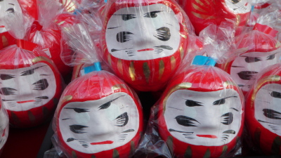福達磨歳末から新年、節分まで、「福達磨」として売られる。新年に開運厄除けを祈願して神棚に飾られる。売り出されたときは両目とも白で、片方の目に願い事をかけながら墨をぬる。願いが叶ったときにもう片方の目に墨をぬり、酒肴を添えて祝う。関西ではこの風習はない。写真は深大寺のもの。 福達磨買ひしことなしこの先も クリックしてね ↓ 人気ブログランキングへ 俳句・新年・人事、達磨市・福達磨