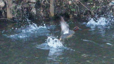 小鴨の飛翔野川沿いの神明橋の上手に小鴨が5・6羽遊んでいた。小鴨はふとした物音にいっせいに飛び立った。1羽しか写っていないのは残念だ。否、1羽でも写っていれば良しとしなければ。貌の緑と朱色の模様から小鴨の雄と知れる。 水蹴つて小鴨翔ちたる野川かな クリックしてね ↓ 人気ブログランキングへ 俳句・冬・動物、小鴨、野川