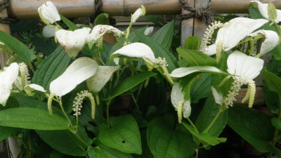 半夏生草(はんげしやうさう)ドクダミ科の多年草。湿った場所を好む。葉は6月の終わり頃に茎先の2・3枚が白くなる。それと同時に浅黄色の小花を密生した花穂を出す。葉が白くなるのは虫を呼ぶため。名の由来は七十二候の半夏生の頃に葉が白くなるからとも。片白草(かたしろぐさ)・三白草(みつしろさう)とも呼ぶ。砂町のO小学校に池があり、あさざや半夏生草が花を咲かせていた。 半夏生の白の染み入る昼下り クリックしてね ↓ 人気ブログランキングへ 俳句・夏・植物、半夏生草・片白草