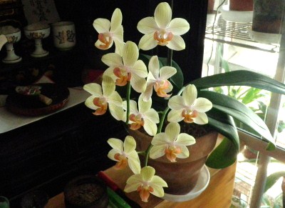昨年Mさんから頂いた蘭の花 昨年句集『山鉾』出版のお祝いにとMさんから蘭の花を頂いた。(ブログ平成23年11月28日掲載)蘭の花枝を剪り、ガラスの箱に入れ育んできた。その蘭が真夏の今、可憐な花を咲かせている。早速仏壇に供え仏と人間とで鑑賞している。私の部屋に仏壇があり、窓から涼風が吹き込んでくる。Mさんこのブログ見るかしら。Mさんの涼しげな姿を浮かべながら、私は顔をほころばせている。 ふたたびの蘭の花かな涼しかり クリックしてね ↓ 人気ブログランキングへ 俳句・夏・時候、涼し、Mさんから昨年頂いた蘭の花