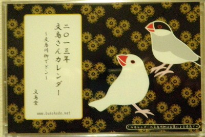 文鳥堂より来年度のカレンダーがでました。「文鳥点取り占い」もよろしく。下記URLにて検索ください。 文鳥堂 http://www.bunchodo.net/ クリックしてね ↓ 人気ブログランキングへ 文鳥堂・2013年文鳥さんカレンダー、文鳥点取り占い