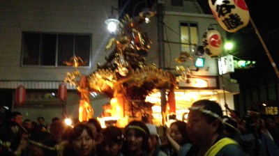 秋祭世田谷区玉川神社の秋祭。昼前から三々五々神輿かきの人が集まって町内を練り歩く。句会後懇親会を終了して午後6時半を過ぎても未だ神輿が威勢良い声をだし、練っていた。 秋祭町も神輿も灯を灯し クリックしてね ↓ 人気ブログランキングへ 俳句・秋・宗教、秋祭