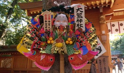 酉の市(大國魂神社) 大國魂(おほくにたま)神社境内に坐す大鷲(おほとり)神社 大熊手十一月の酉の日に行われる鷲大明神の祭礼で、「お酉さま」といって親しまれている。東京下谷の鷲神社がもっとも名高く、開運、商売繁盛の神として信仰されていた。酉の市の特色は縁起物の商いで、代表的なものとして大きなおかめの面などを飾りつけた熊手である。今日は府中の大國魂神社へ行った。熊手が売れる度三本締めの拍子木が鳴った。面亀は店名。昼間であったが連れと参道脇の出店でたこ焼きともつ煮込みを買い、ちょっと一杯。 面亀の拍子木弾み一の酉 クリックしてね ↓ 人気ブログランキングへ 俳句・冬・人事、一の酉・酉の市、大國魂神社