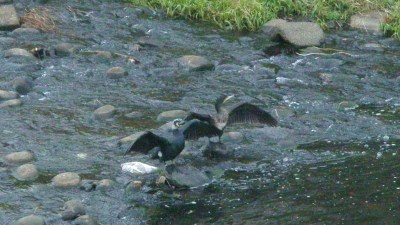 水鳥 川鵜は水鳥である。野川の川鵜がいつも一羽で寂しそうと思っていたところ、珍しく二羽が共に行動していた。新しくやってきた川鵜は青みを帯びている。海鵜は緑がかっているので、海鵜の遺伝子が混じっているのかも。『野鳥ガイドブック』(永岡書店)の豆知識によると、「鳥は尾脂線の脂を羽毛に塗り込めて防水するが、ウ類はこれが未発達。浮力が小さくなり、潜水して魚をとるには有利だが、採餌後ぬれた翼を拡げて乾かさなければならない」と。なるほど、それで川鵜が翼を拡げている場面にしばしば合うのだと判明した。 水鳥の二羽並(なみ)翼拡げをり クリックしてね ↓ 人気ブログランキングへ 俳句・冬・動物、水鳥、野川
