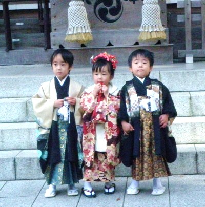 はー君とお友達 七五三祝【七五三】祝儀に用いる数。一三五七九の奇数をめでたいとして、その中の三つを取ったもの。男子は3歳と5歳、女子は3歳と7歳とに当たる年の11月15日に氏神に参詣する行事。はー君の5歳の祝いを神鳥(しとど)前川神社であげるというのででかけた。写真の坊ちゃんと嬢ちゃんははー君の保育園のお友達。左から5歳3歳5歳のお祝い。とても嬉しそうで安心した。今は何のことか3人とも解っていないが、大きくなってから大切に育てられたことが解るというもの。神官が子どもに「パパとママにありがとうと言いましょう」と話されたが、子ども達はそんなことにお構いなし。とうとう「かしこみかしこみ申し候」と四角四面に唱えておられた神官に笑顔がこぼれた。微笑ましい光景である。 鈴の音を確かむる児や七五三 クリックしてね ↓ 人気ブログランキングへ 俳句・冬・人事、七五三の祝・七五三・しめ祝