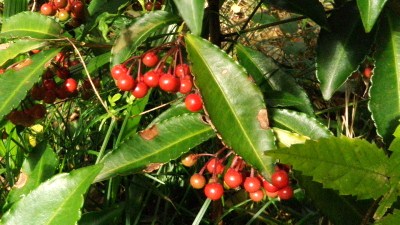 万両ヤブコウジ科の常緑低木。色の少ない冬の山野、また庭園に紅を点ずるものとして、「千両」「万両」と並び称される。実は千両より大粒で冬中落ちない。千両に勝るので万両だとか。そう言えば、万両は千両より紅く艶々して見える。今日宝くじを買えば大金が当たるかも、なんて、でも買わないと当たらないのは確か。 万両を見たる日宝くじ買はむ クリックしてね ↓ 人気ブログランキングへ 俳句・冬・植物、万両