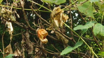 枯烏瓜道路に落葉がびっしりと落ち、尚風に木の葉が舞っている。通りがかりの男性が落葉を掃く女性に「大変だね、でも風情があっていいなあ」と声をかけた。女性は「お年寄りが足を滑らせるので」と落葉を掃きながら応えていた。枯れゆくものへの愛着を持つことは素晴らしいと思いつつ私は二人の会話を聴いていた。烏瓜の実は荒れ止めの化粧水に、種子は薬用・食用となる。また塊根から採って澱粉は天花粉の代用にもなる。枯れ烏瓜にもまた愛着を感じる。 薬園の枯烏瓜弾けをり クリックしてね ↓ 人気ブログランキングへ 俳句・冬・植物、枯烏瓜