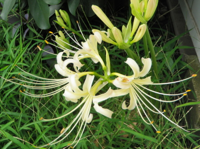 句会場に使っている地区センターがようやく耐震工事に入った。その 間ハイタウンの集会室を使っている。先日管理室へ集会室の鍵を貰い に行ったところ、植え込みに白曼珠沙華が咲いていた。曼珠沙華は一 度植えたら毎年同じ場所に咲くのに今まで気付かなかったのが不思議 である。花言葉は悲しき想い出である。 誰にでも想出ありぬ曼珠沙華 クリックしてね ↓ 人気ブログランキングへ 俳句・秋・植物、曼珠沙華・白曼珠沙華