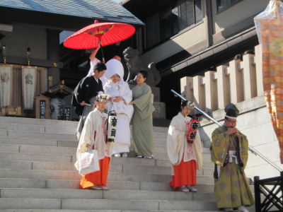 芝神明の祭に去る九月十三日に訪れた。昔付近に生姜が作られ生姜を 供えたことから「生姜市」という。「だらヾヽとだらヾヽまつり秋淋 し」と久保田万太郎が詠んでいるように、九月十一日から二十一にち までと祭の期間が長いので「だらだら祭」ともいう。 私が参道に着いたとき折り良く花嫁さんが社の階段を下りてきた。辺 りの人に混じって祝福の拍手をしたのはいうまでもない。参道の真ん 中に神輿があり、その横で老人が千木筥を組み立てながら売っていた。 千木筥は檜の曲げ物の箱で、外面に藤の花を描き、中に煎った大豆を 2~3粒入れてあり、千木と千着の音通から箪笥の中に入れておくと 着物がふえるといわれる。千木筥は今私の洋服掛けにかけてある。 花嫁に逢ふもえにしや生姜市 クリックしてね ↓ 人気ブログランキングへ 俳句・秋・人事、芝神明祭・生姜市・だらだら祭・千木筥