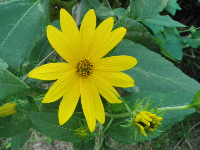 キク科の多年草。花びらは直径4センチくらいで、黄色い菊に似てい る。根はころころして、芋に似ているのでこの名がついた。野川の川 岸の所々に咲いている。一面の草原の中で鮮やかな黄色が目立ってい る。綺麗な花なのに菊芋などと芋の名をつけられ迷惑をしているよう に思う。花言葉は元気。 菊芋の花に元気を貰ひたし クリックしてね ↓ 人気ブログランキングへ 俳句・秋・植物、菊芋の花、野川