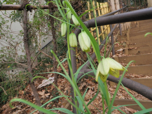 世田谷区四丁目の十一山は低い山である。いつ登っても誰とも会わない。その土の急 な階段の途中に貝母が咲いていた。年に何回か登っているが貝母の花にあったのは始 めてである。 階下る貝母の花を慈しみ クリックしてね ↓ 人気ブログランキングへ 俳句・春・植物、貝母の花、十一山
