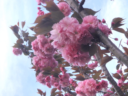 野川沿いの谷戸橋下流の南側にのマンションに十数本の八重桜がある。山桜についで 八重桜も満開を迎えた。ソメイヨシノははらはらとこぼれる様に散るが、八重桜は一 ひらずつは散らない。儚いが強い感じをうけるのはその所為かも知れない。今日は風 が強く正午のニュースでは静岡に雹が降ったと言っていたが、東京は今以て晴れてい る。 八重桜誰彼のほほ薄紅に クリックしてね ↓ 人気ブログランキングへ 俳句・春・植物、八重桜