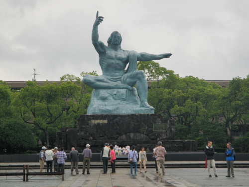 平和祈念像 平和公園の噴水 午後は雨が小振りになり、降ったり止んだりの繰り返しであった。長崎平和公園は二 度目であるが、八月九日の原爆忌には平和祈念像がテレビに映し出される。テレビの 前での祈りと平和祈念像の前での気持ちに差はないが、より深く、より長く祈りを捧 げた。振り返ると噴水が虹の色に輝いて見えた。 噴水に虹立ちにけり雨あがり クリックしてね ↓ 人気ブログランキングへ 俳句・夏・人事、噴水、長崎平和公園