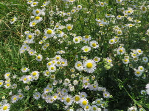 【姫女菀】ひめじょおん(俗にヒメジオンとも)キク科の越年草。北アメリカ原産の帰化植物。雑草として普通で、ときに大群落を作る。若芽は食用。野川沿いのサイクリング道路に蔓延っている。このところ野川沿いの草刈りが行われていて、姫女菀も容赦なく刈られている。名前に姫がつき花も小菊に似て美しいのにと、此の花を見るにつけ不運な花だと思う。 群咲いて御殿の如し姫女菀 クリックしてね ↓ 人気ブログランキングへ 俳句・夏・植物、姫女菀