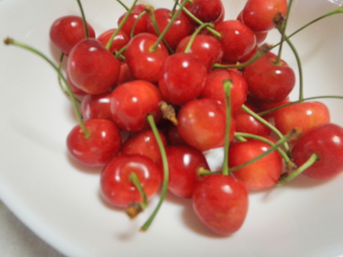 野川沿いの桜の実はすっかり熟れて黒くなった。しかし桜の実を食べる人はいない。一方桜桃は花はサクラに似るが白い。果実はさくらんぼと称して食用に栽培される。西アジア原産で冷地を好む。ナポレオン・佐藤錦などの品種がある。写真のさくらんぼは山梨の高砂という品種で、佐藤錦よりは酸味があり見た目どおり美味しい。 さまざまな縁のありてさくらんぼ クリックしてね ↓ 人気ブログランキングへ 俳句・夏・植物、さくらんぼ