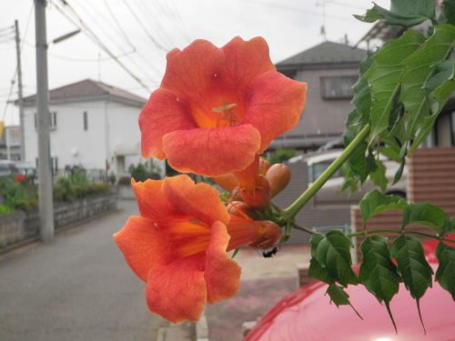 ノウゼンカズラ科の蔓性落葉樹。高さ10メートルにもなる。幹は付着根によって他物によじ上る。茎頂に橙赤色の大花を開く。いつも歩いている道へ突然突き出して凌霄の花が咲く。色が煉瓦色なので、なぜか大正のロマンを感じるのは私だけではあるまい。 凌霄花大正ロマンなどと云ひ クリックしてね ↓ 人気ブログランキングへ 俳句・夏・植物、凌霄花(のうぜんかづら)、凌霄(のうぜん)、凌霄の花