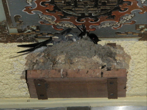 5月31日の夜は新地中華街でメンバー5人と長崎ちゃんぽん、長崎皿うどん、角煮 饅頭。飲み物は生ビールと紹興酒を少々。いずれも本場の味である。食事の後中華街 を歩いていると、夏燕が飛び交っていた。燕の姿を目で追うと中華料理店の店先の軒 の巣へ入って云った。黒い燕尾服は親燕で手前に白い嘴が三羽並んでいるのが子燕で ある。親燕を待ってピーピーと必死で鳴いている。早く大きくなあれと思わず手を振 った。よく見ると燕の巣を造るに相応しい台が設えてあった。 燕の子新地に夜のきてをりぬ クリックしてね ↓ 人気ブログランキングへ 俳句・夏・動物、燕の子、新地中華街