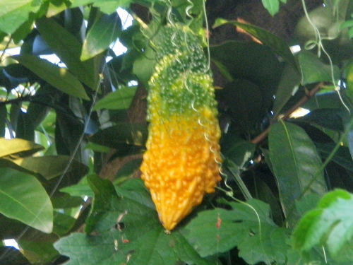 熱帯アジア原産。夏五弁の黄色い小さな花が咲き、秋に疣状の突起のある実がなる。熟れると此の様に黄色になる。食べ頃は緑色のときで、此の様に熟れるともう食べられない。苦瓜の苦さに慣れるとやみつきになる。苦瓜を貰ってきたというので喜んで袋を覗くとえっこんなに沢山と途方に暮れてしまう。油断しているとすぐ熟れてしまうからである。 袋より苦瓜覗く五六本 クリックしてね ↓ 人気ブログランキングへ 俳句・秋・植物、苦瓜