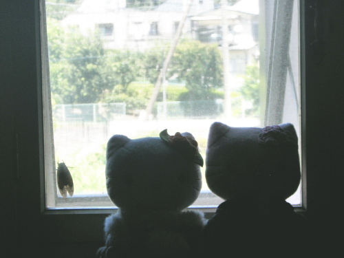 玄関を入った右側下駄箱がありその上に窓がある。午前10位頃川向こうに救急車が来た。窓から覗いた時はいなかった蝉が昼過ぎにその窓の網戸に止まっていた。一声も鳴かないので雌の蝉だろう。下駄箱の上のキティーとずっとお話をしているようだ。 昼下り蝉が訪ねてきたりけり クリックしてね ↓ 人気ブログランキングへ 俳句・夏・動物、蝉