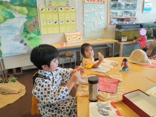 世田谷トラスト協会はー君が浴衣を着たいと言っているので何処か祭がないかと捜したが見つからなかった。そこで、先日紹介した世田谷トラスト協会へ行ってみた。中は野川の生態が解る水槽があった。メダカ、オイカワ、フナなどが元気に泳いでいた。昆虫のところにはカブトムシやザリガニが飼育されている。他に児童用の図書もあった。しかし余り人が入っていないのは展示物が乏しく、子ども達を惹きつけるものがないからだろう。はー君は常に熱が37度台と高いので、浴衣の上から保冷剤を入れたICE・BACKを背負っている。それでも本人は元気なのが救いである。さーちゃんは3歳。活発なので、浴衣を着ていてもジャングルジム(ハイタウンの公園)を自由に上り下りをする。二人は昨日帰って行った。子ども達の夏休みはまだまだ続く。 児ら連れて働く母の盆休 クリックしてね ↓ 人気ブログランキングへ 俳句・秋・人事、盆休み、世田谷トラスト協会