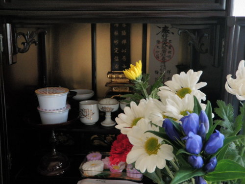 仏壇は主人の両親の位牌が祀ってある。お菓子をと水を供えて、お花も飾った。仏飯やお水をあげるのも私の役目になっている。肝心の主人は今故郷の鳥取へ帰省していて留守。彼は誰も住んでいない家の周りの草むしりや、お墓の掃除で忙しい。京都にある私の両親の墓は弟に任せきりになっているので西へ足を向けては寝られない。お盆はこんなふうに過ごしている。 開け放し盂蘭盆の風入れにけり クリックしてね ↓ 人気ブログランキングへ 俳句・秋・宗教、盂蘭盆