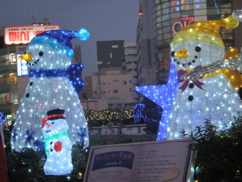 雪の3兄弟・冬物語雨は午後3時頃から降り出すとの予報でしたのに、午後1時過ぎからぽつぽ降り始めた。しかし雨脚はひどくなりませんでした。もうすぐクリスマスです。駅前のイルミネーションもところによって随分違います。このイルミネーションは温もりがありますね。しかしほとんどの人はちらっと見ただけで立ち止まることなく足早に家路へと急いでいます。 極月の人の流れに蹤きゆけり クリックしてね ↓ 人気ブログランキングへ 俳句・冬・時候、極月