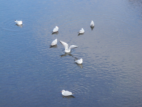 所用があり野川の上流へ自転車で20分かけて目的地に着いた。小足立橋で見かけた百合鴎が車橋まで遡っていた。円陣を組み元気に泳いでいた。途中翡翠や中鷺が雑魚を捕り口にくわえている場面に出会った。雑魚は逃れようとして尾を盛んに動かしていて、動く度に姿態が光っていた。きょうは小正月、鏡餅を善哉に入れて祝った。 百合鴎向きまちまちに憩ひをり クリックしてね ↓ 人気ブログランキングへ 俳句・冬・動物、百合鴎
