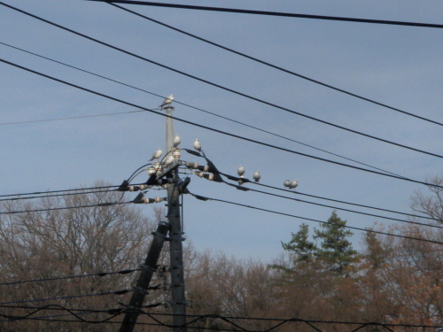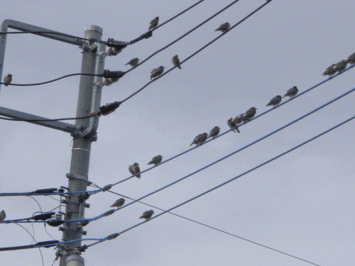 椋鳥の大群が電線に止まっていた。その下を通るといつもなら一斉に飛び翔つが、寒いからでしょうか飛び翔とうとせずに静止していた。寒いと動きたくないと思うのは人ばかりではないように思える。明日からまた冷え込むらしい。 寒禽に野川の風の弱まりて クリックしてね ↓ 人気ブログランキングへ 俳句・冬・動物、寒禽