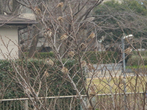 野川の小足立橋の下流の枯木に雀が二十羽程ふくらんで止まっていた。午後三時過ぎのことである。極寒の頃に、寒いので空気の層を厚くするために、全身の羽毛をふくらませて丸くなっている。これを「ふくら雀」という。向かい側は野川句会の会場のかわせみ館、月に1度ここで句会をしている。 けふの宿まう決りしか寒雀 クリックしてね ↓ 人気ブログランキングへ 俳句・冬・動物、寒雀・ふくら雀、野川