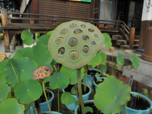 翌日リュックサックを研修会場の郡山のホテルに預け、地図を片手に麓山(はやま)方面へ歩を進めた。消防署の手前に善導寺を発見。芒がこっちよ、こっちへどうぞと云わんばかりに手招きをしてくれた。中へ入ると本堂の脇に蓮のバケツが並べて置いてあり、蓮はすべて実になっていてそれぞれ名札がつていた。耳を澄ますと本堂から声明が聞こえてきた。声明を聴きながら私は蓮の飛ぶのを待った。 朝の寺蓮の実飛ぶを待つてをり クリックしてね ↓ 人気ブログランキングへ 俳句・秋・植物、蓮の実、郡山善導寺