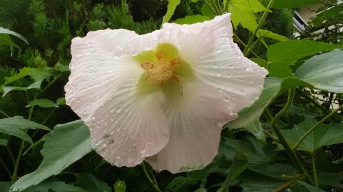 酔芙蓉午後雨が止んでいたので買い物に出かけましたが、帰りに降られてしまいました。酔芙蓉は朝方は花の色が白いですが夕方になるとほんのりと淡紅色に変わります。まるでお酒を飲んだように花の色が染まるのでと呼ばれています。 雨ながら早召されしか酔芙蓉 クリックしてね ↓ 人気ブログランキングへ 俳句・秋・植物、酔芙蓉