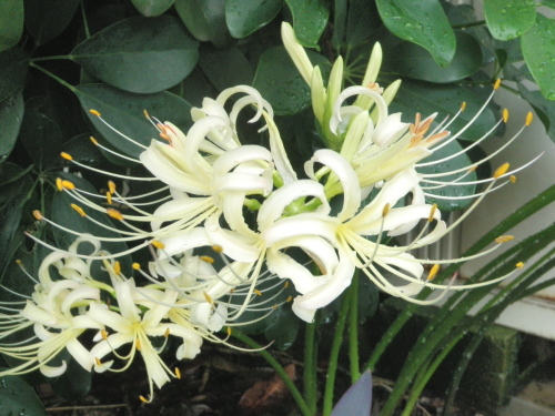 マンションの管理室の庭に彼岸花が咲いている。「赤い花なら曼珠沙華オランダ屋敷に雨が降る」という歌を口ずさみながら、雨の白彼岸花を撮影した。きょうは秋の彼岸の入り、また敬老の日でもある。朝か日でもあるら小雨が降り続いているが、今になって雨脚が強くなった。 雨被き白彼岸花明るかり クリックしてね ↓ 人気ブログランキングへ 俳句・秋・植物、白彼岸花