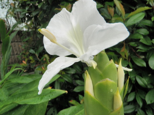 午後3時頃から雨の予報が出ていましたが、雨は降りそうになく相変わらず秋暑に悩まされています。各地の豪雨禍を見るにつけ、贅沢は言っておられませんが。野川沿いの生け垣にジンジャーの花が見られます。真っ白で清楚感が漂う花です。 ジンジャー咲く髪伸ばすのをやめし子に クリックしてね ↓ 人気ブログランキングへ 俳句・秋・植物、ジンジャーの花