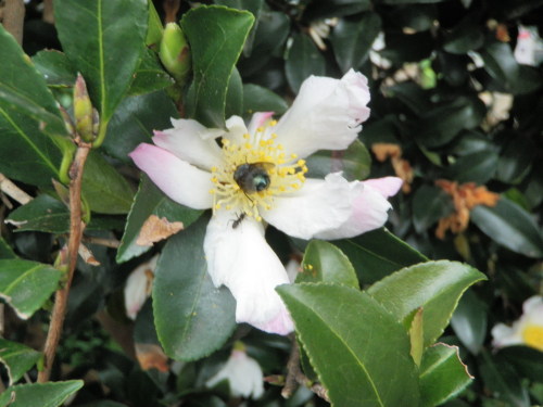 山茶花垣の山茶花が咲き始めた。花のいろは紅もあれば白もある。この山茶花のように白いがうす紅がさしているのもある。虻が花の蜜を吸いにきている。 山茶花に虻の来てゐる昼下り クリックしてね ↓ 人気ブログランキングへ 俳句・冬・植物、山茶花