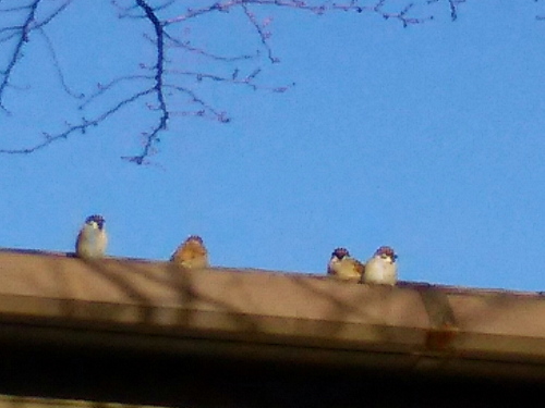 いつも句会をしている地区センターの屋根に寒雀が10羽ほど1列になって日向ぼこをしている。チュンチュンと鳴く声は人が立ち話をしているように楽しげである。全身の羽毛を脹らませて丸くなっているので、ふくら雀ともいう。 寒雀おのづと顔のほころびぬ クリックしてね ↓ 人気ブログランキングへ 俳句・冬・動物、寒雀・ふくら雀