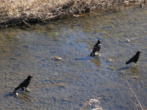 鴉は飛べるが泳げない、軽鴨は飛ぶことも泳ぐこともできる。野川の浅瀬に軽鴨が餌をあさっているところへ寒鴉が止まろうとした。さて、あなたは軽鴨と寒鴉のどちらが力があると思いますか。つぶさに見ていると軽鴨が寒鴉を蹴散らしていた。そう、軍配は軽鴨に上がった。 一様に敵を見返す寒鴉 クリックしてね ↓ 人気ブログランキングへ 俳句・冬・動物、寒鴉、野川