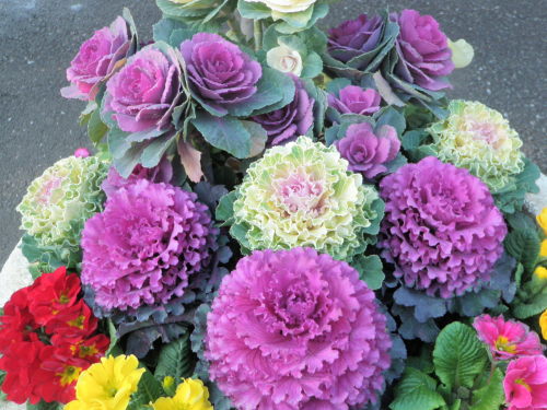 葉牡丹はあちこちで見られる。ヨーロッパ原産のアブラナ科の多年草。キャベツの観賞用品種で結球しない。葉が紫紅色のものを赤葉牡丹、クリーム色のものを白葉牡丹という。 葉牡丹の渦へ魂吸込まる クリックしてね ↓ 人気ブログランキングへ 俳句・冬・植物、葉牡丹